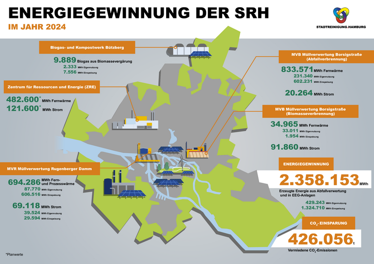 Nicht-recycelbare Abfälle werden in an Anlagen thermisch vewertet und daurch Energie in Form von Wärme, Strom und Biogas für Hamburg erzeugt. So leisten wir einen Beitrag zur Senkung der gesamtgesellschaftlichen Emissionen. Um die Wirkung transparent darzustellen, haben wir die vermiedenen CO₂-Emissionen erfasst.