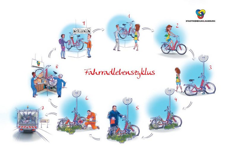 Fahrräder durchlaufen während ihres „Lebens“ unterschiedliche Phasen. Beginnend mit dem Erwerb (1), über die Nutzung (2), bis hin zu der Entscheidung, dass ein Fahrrad nicht mehr genutzt wird.