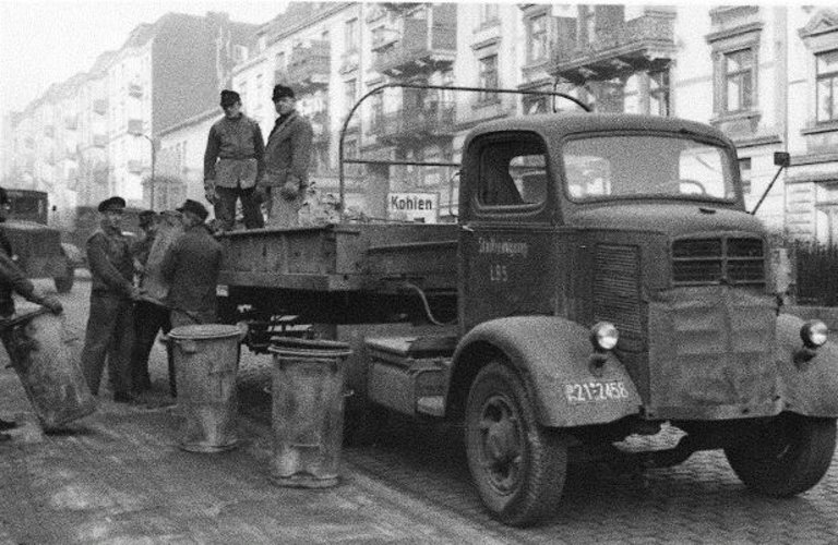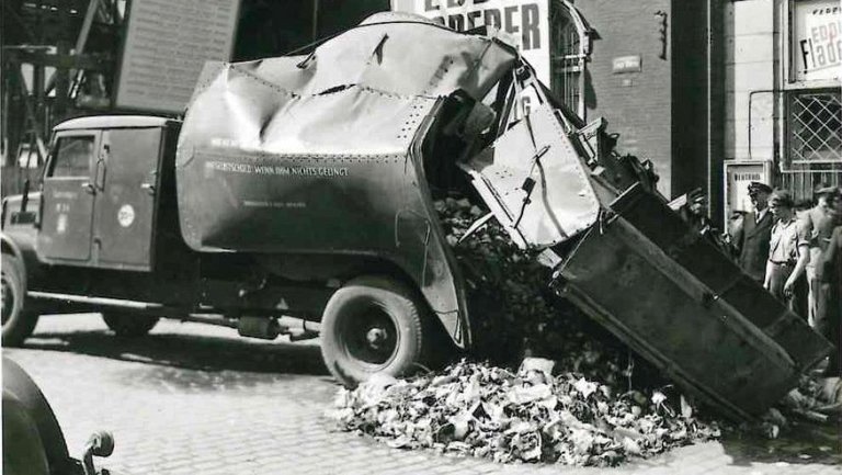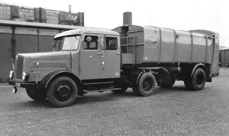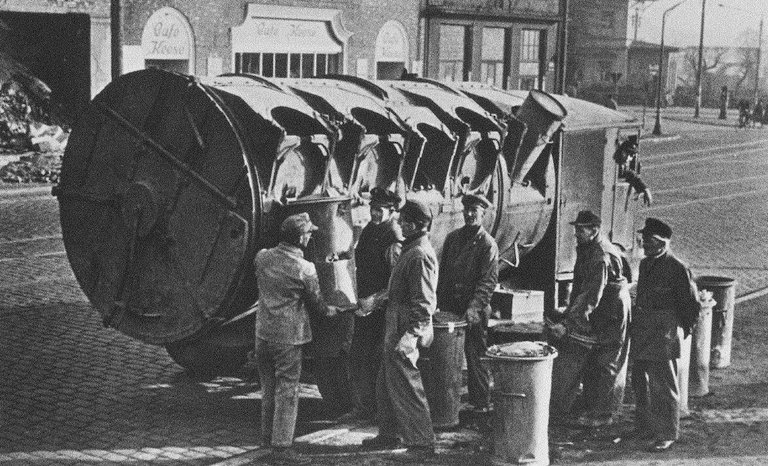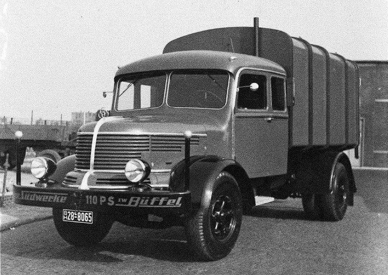 Auch Fahrzeuge aus der Vorkriegszeit wurden eingesetzt, wie dieser Faun-Müllwagen in der Fruchtallee (Eimsbüttel), Baujahr 1928, Ladekapazität: 10 Kubikmeter.