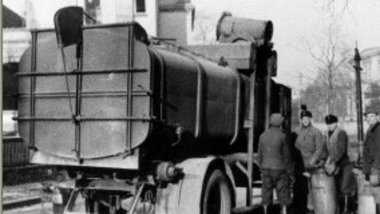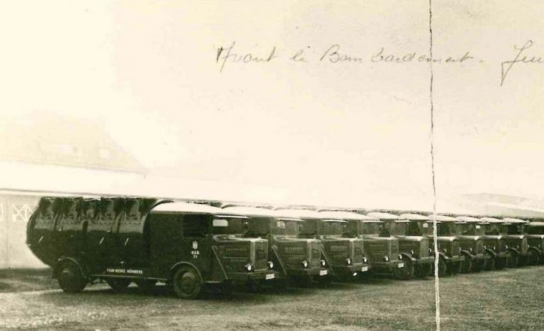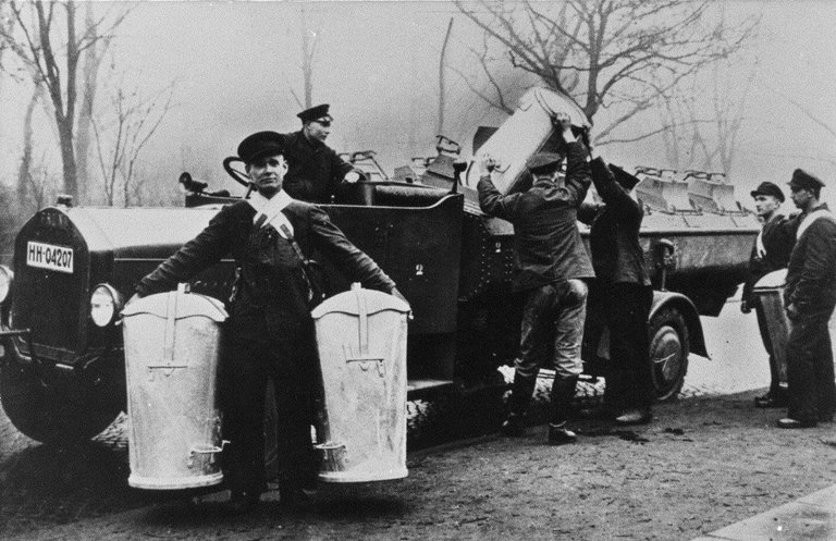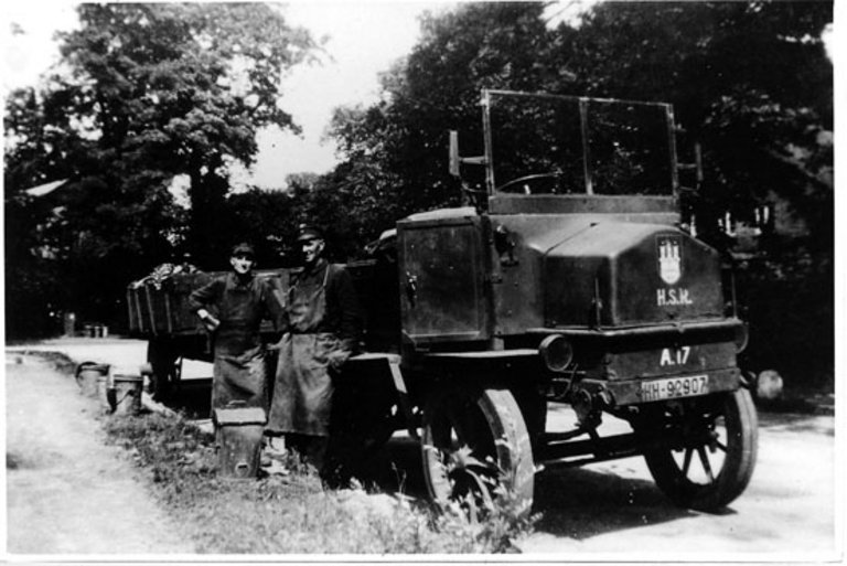 Fuhrpark der Hamburger Stadtreinigung vor den Bombardements der Alliierten. Am 28. Juli 1943 geriet durch Brand- und Sprengbomben fast die gesamte Innenstadt in Brand, etwa 35.000 Menschen kamen bei diesem Feuersturm ums Leben.