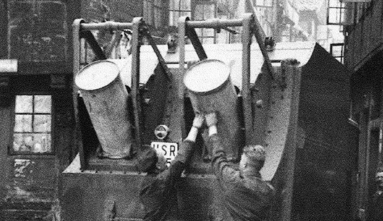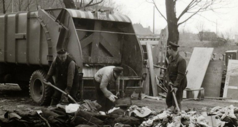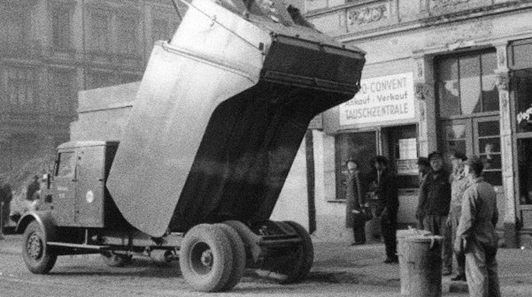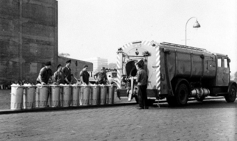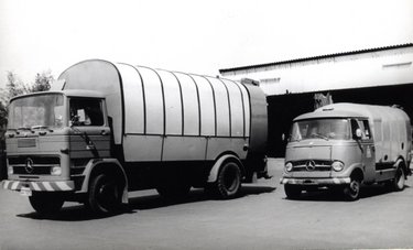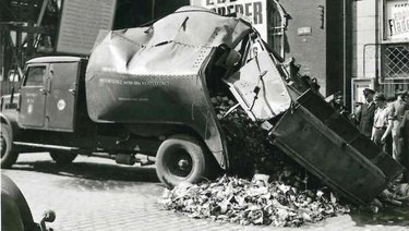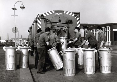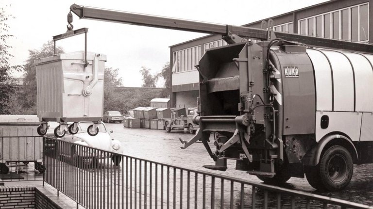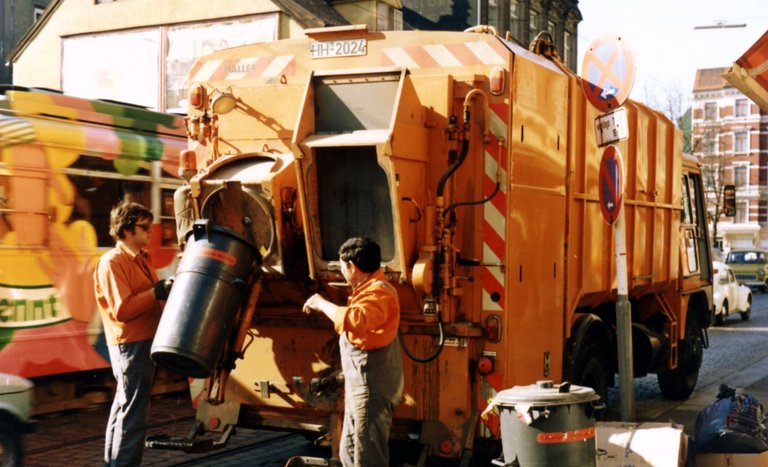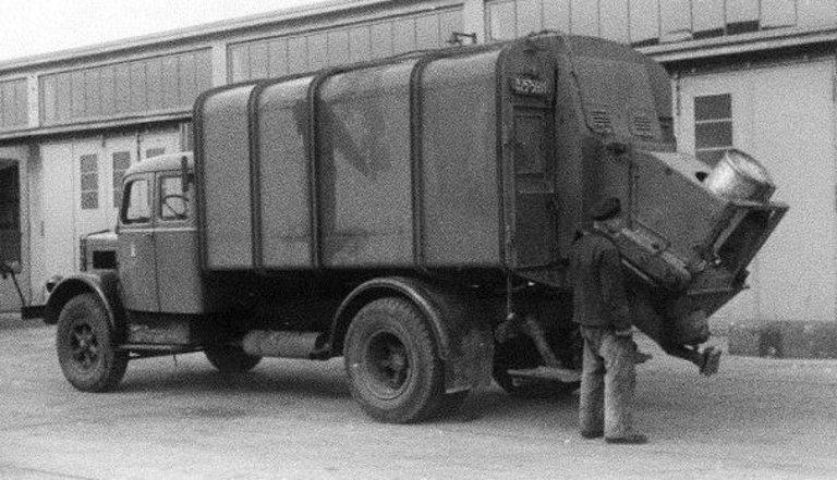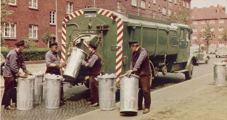 In den 60er Jahren waren bei der Stadtreinigung z.B. diese grünen Müllautos mit Haller-Aufbauten im Einsatz. Die genormten Eisentonnen (Füllmenge: 110 Liter) mussten von den Müllmännern noch mit einer speziellen Drehbewegung zum Müllfahrzeug „getrudelt“ und dann in die Schüttung eingehängt werden.