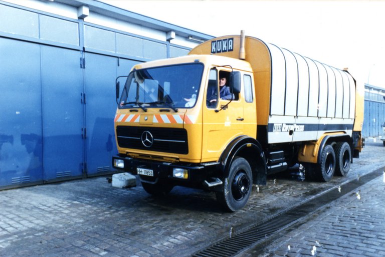 Müllwagen Kuka Rotopress für einen Fahrer und bis zu zwei Auflader. Dieses Fahrzeug wurde für Sondertouren und in kleinen Straßen eingesetzt.