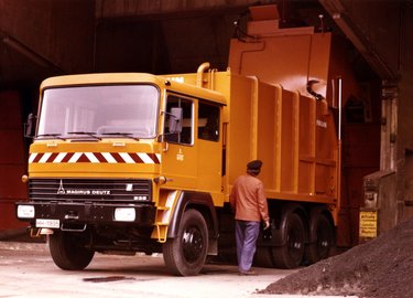 Müllfahrzeug mit Faun-Aufbau beim Kippen in der (alten) Müllverbrennungsanlage in der Borsigstraße.
