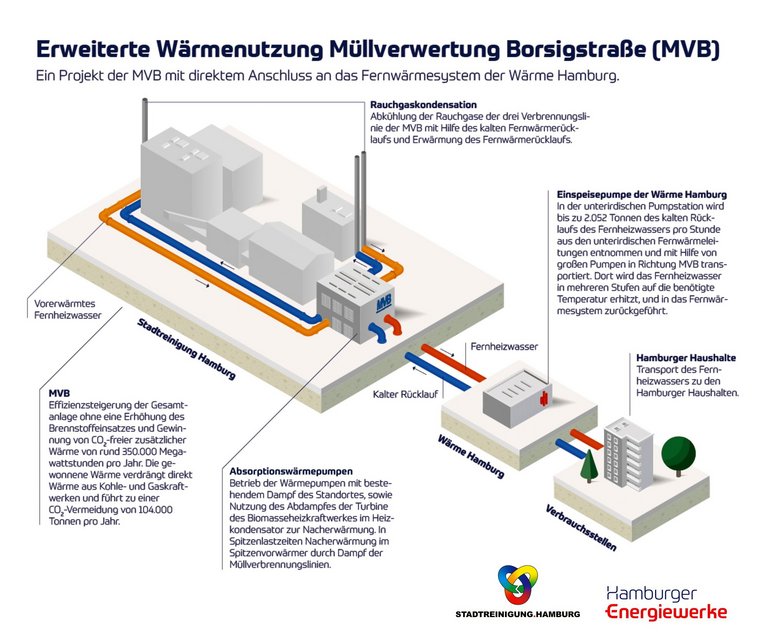Die Stadtreinigung Hamburg hat in Zusammenarbeit mit der Behörde für Umwelt, Klimaschutz, Energie und Agrarwirtschaft (BUKEA) und den Hamburger Energiewerken das Projekt zur "Erweiterten Wärmenutzung" in der Müllverwertungsanlage Borsigstraße (MVB) umgesetzt.